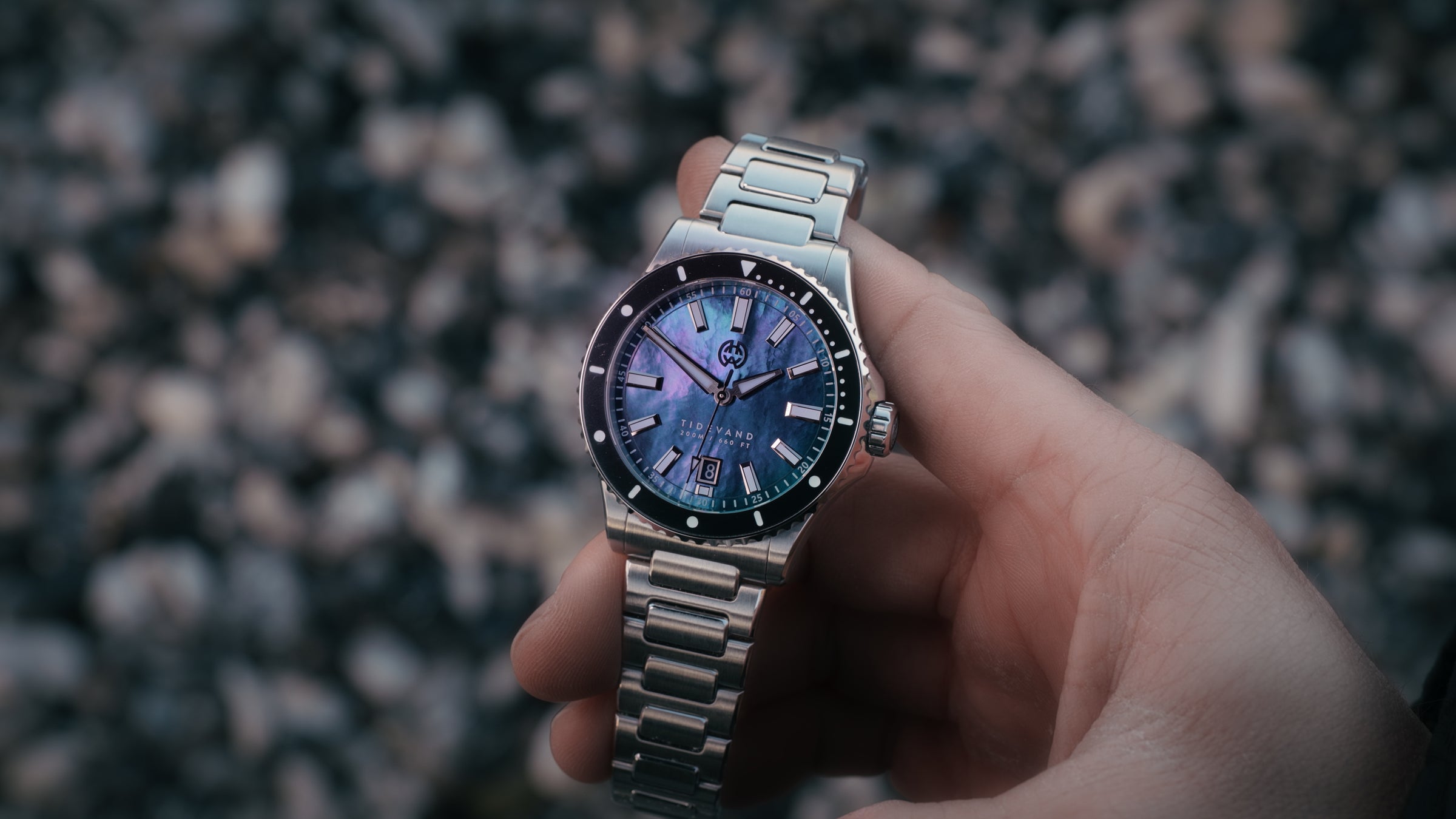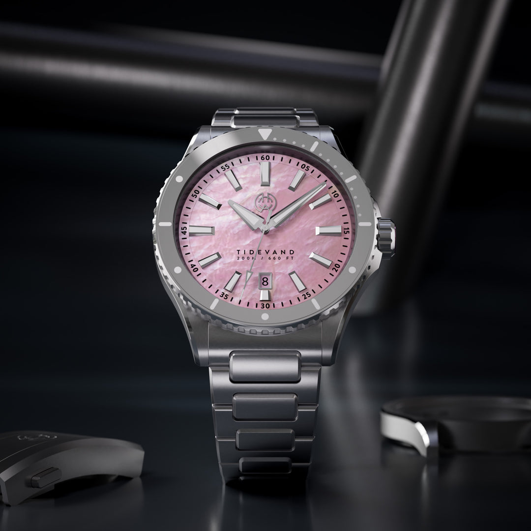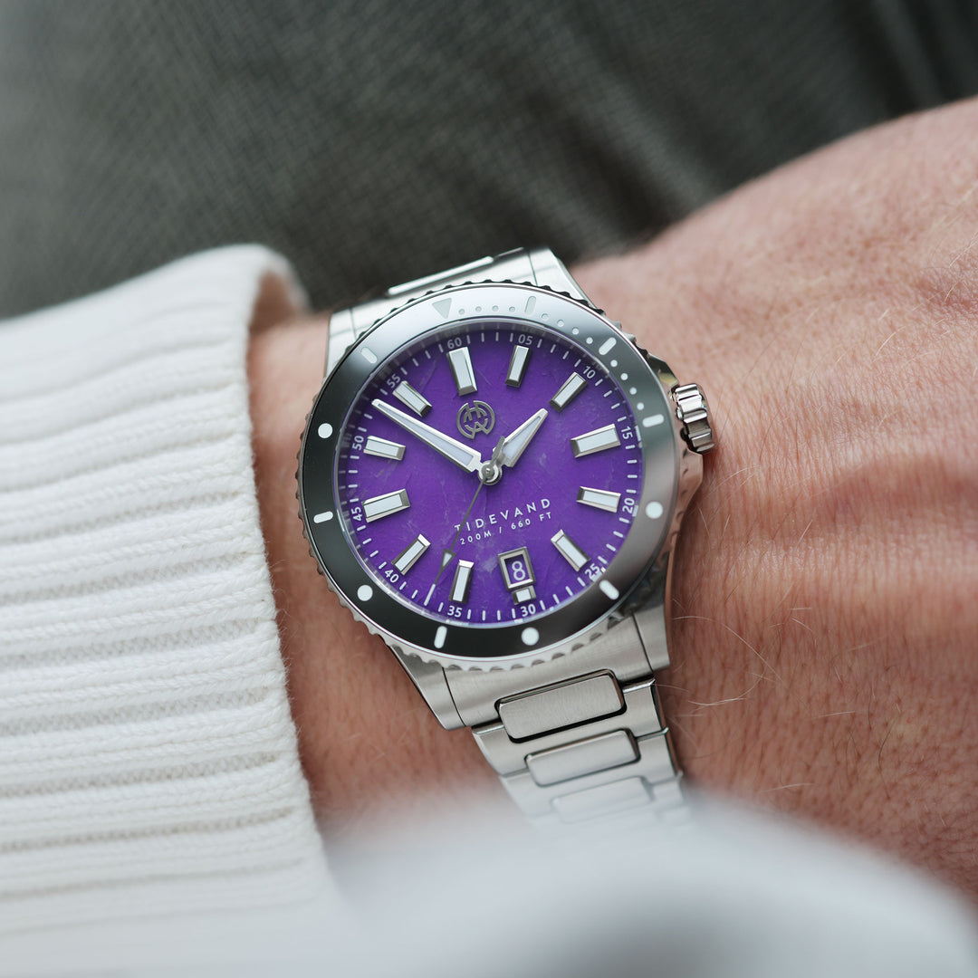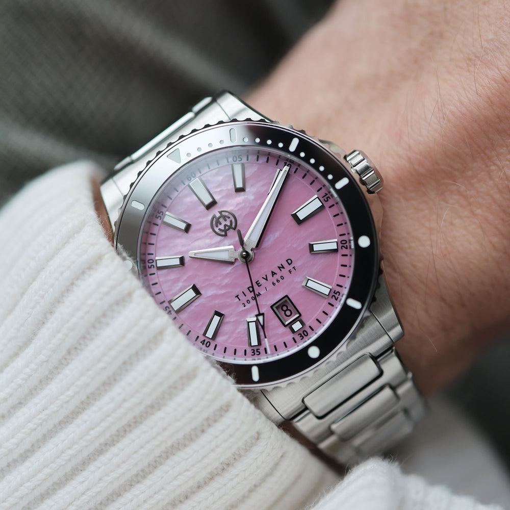 Natural materials define Tidevand Element. Red agate, amethyst, malachite, and mother of pearl meet functional dive watch design, with 200 meters of water resistance, and tungsten bezels on selected models.