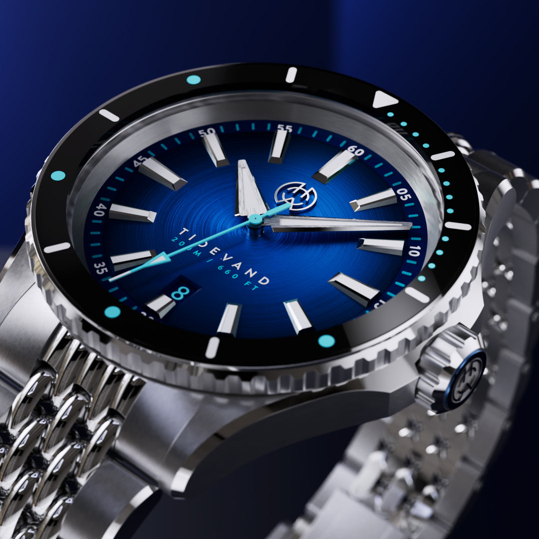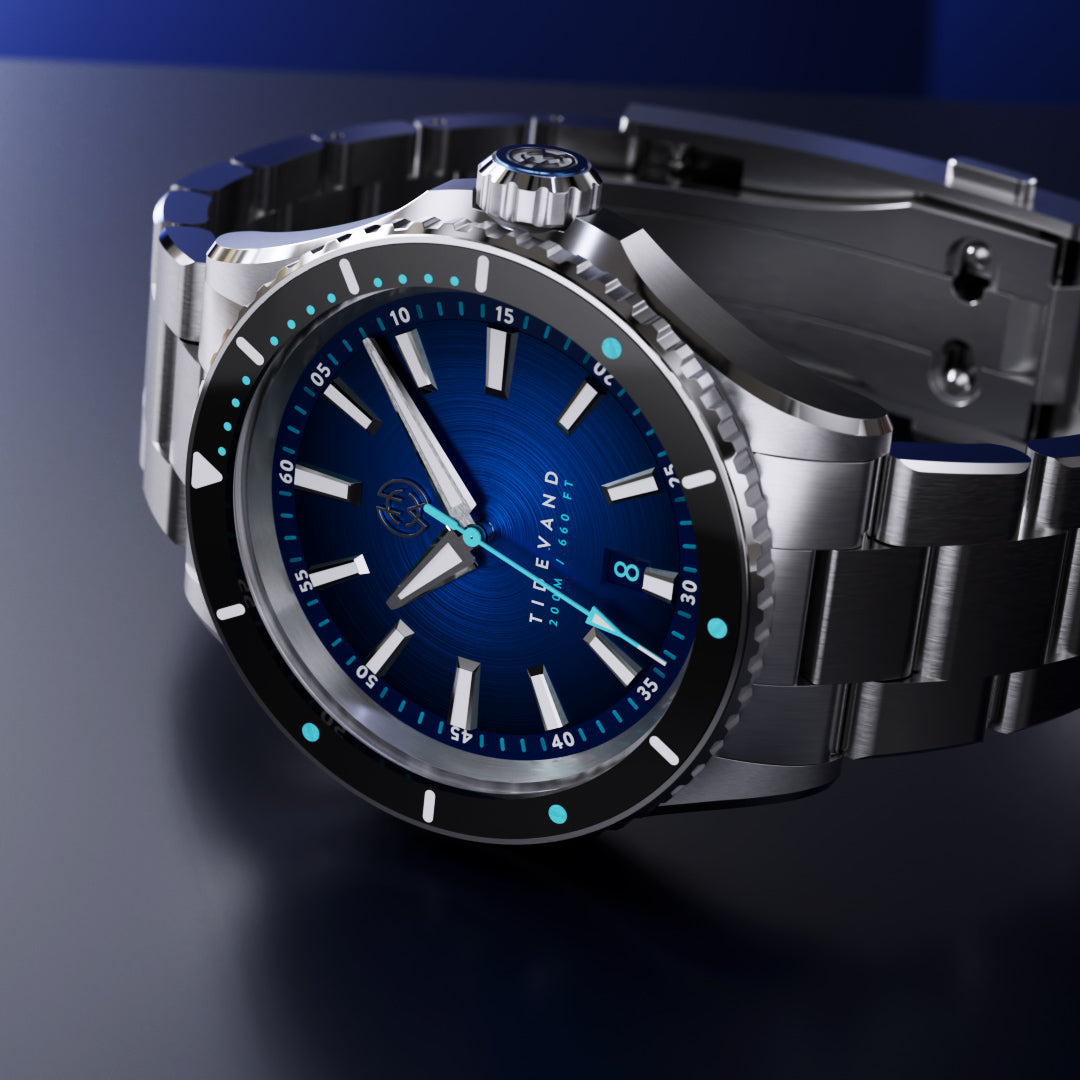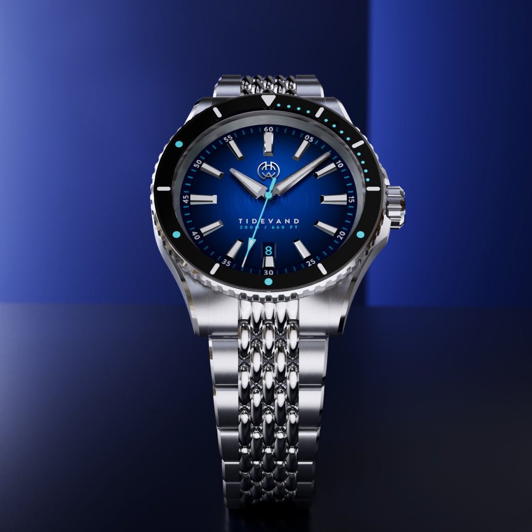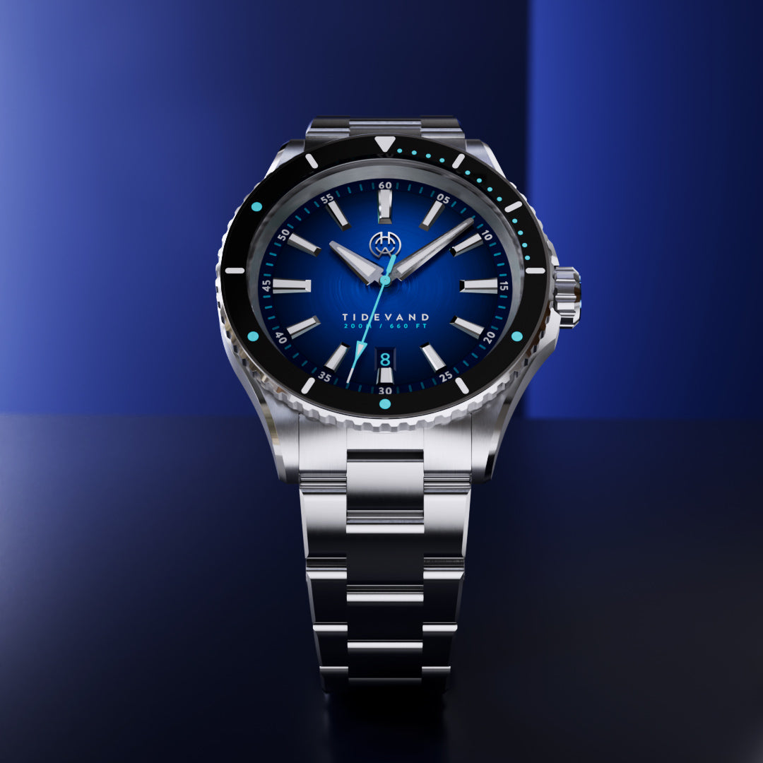 TIDEVAND is a purpose-built dive watch with 200 meters of water resistance, strong nighttime visibility, and a 120-click diver's bezel for precise timing. Designed for use in and around the sea, it balances rugged construction with refined finishing.