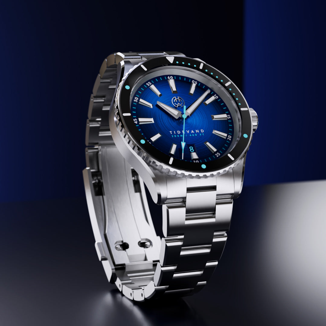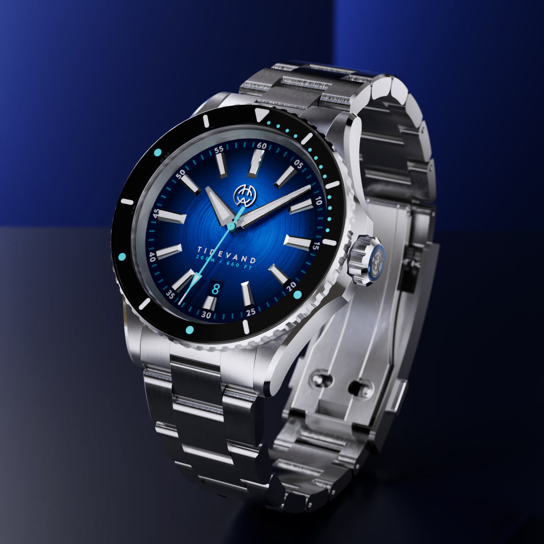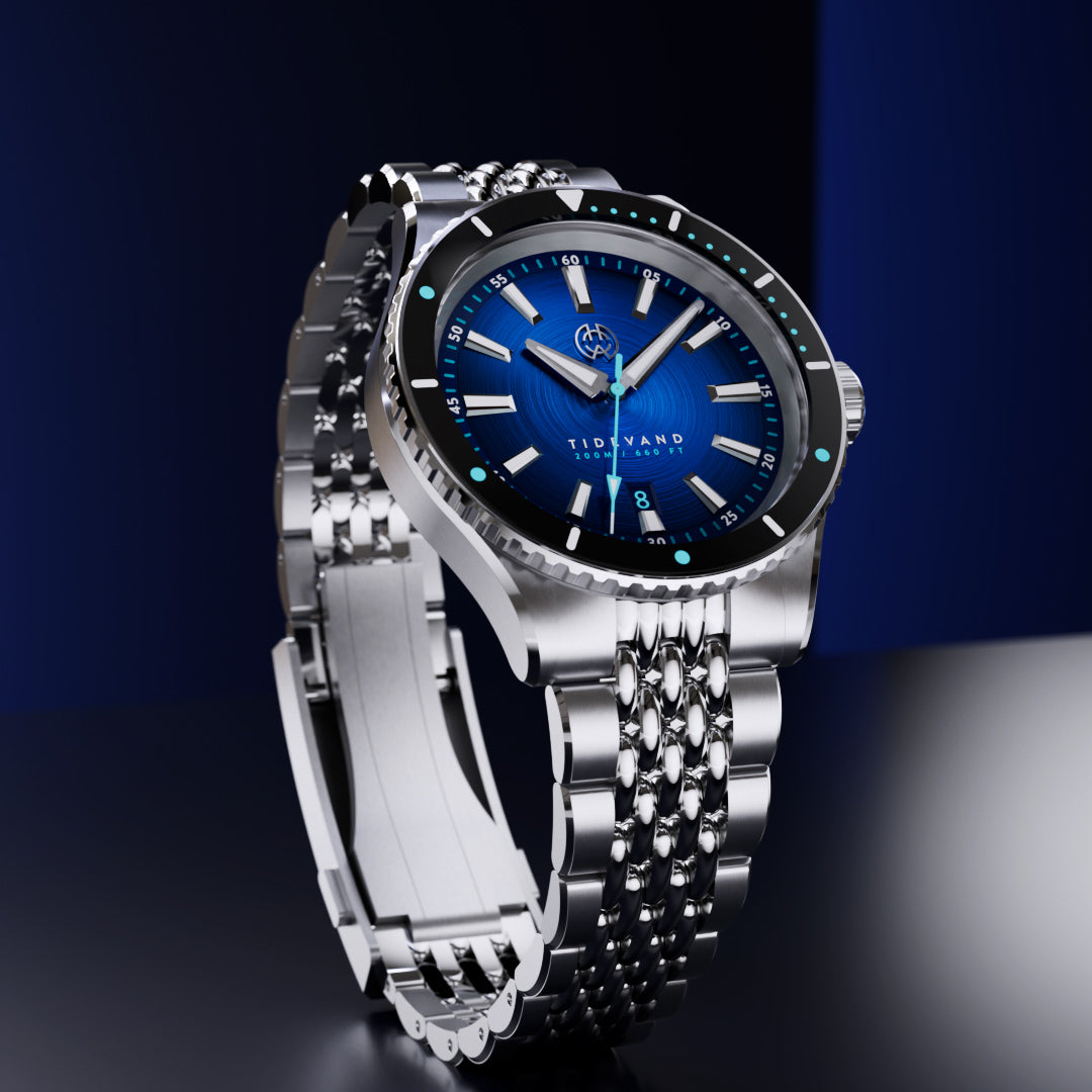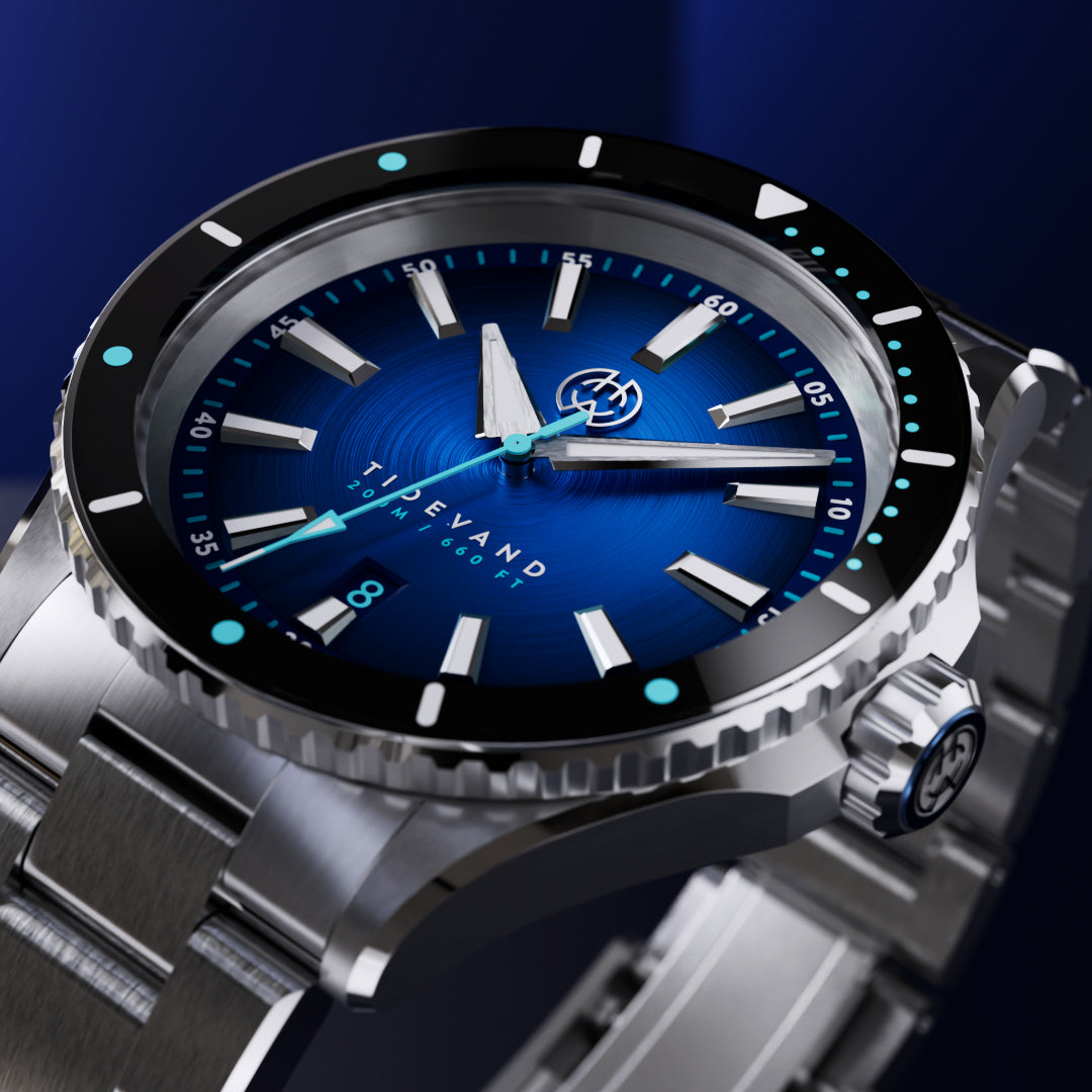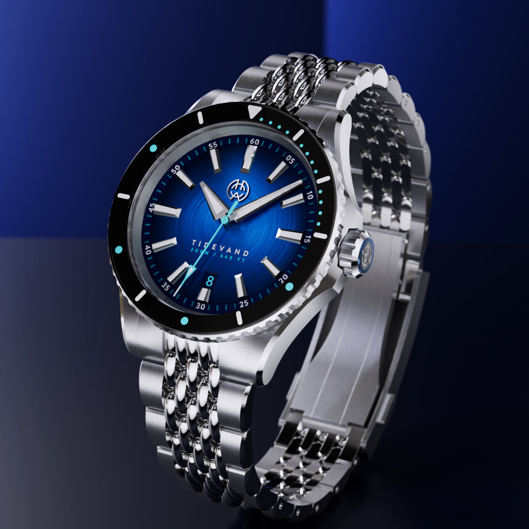 TIDEVAND is a purpose-built dive watch with 200 meters of water resistance, strong nighttime visibility, and a 120-click diver's bezel for precise timing. Designed for use in and around the sea, it balances rugged construction with refined finishing.