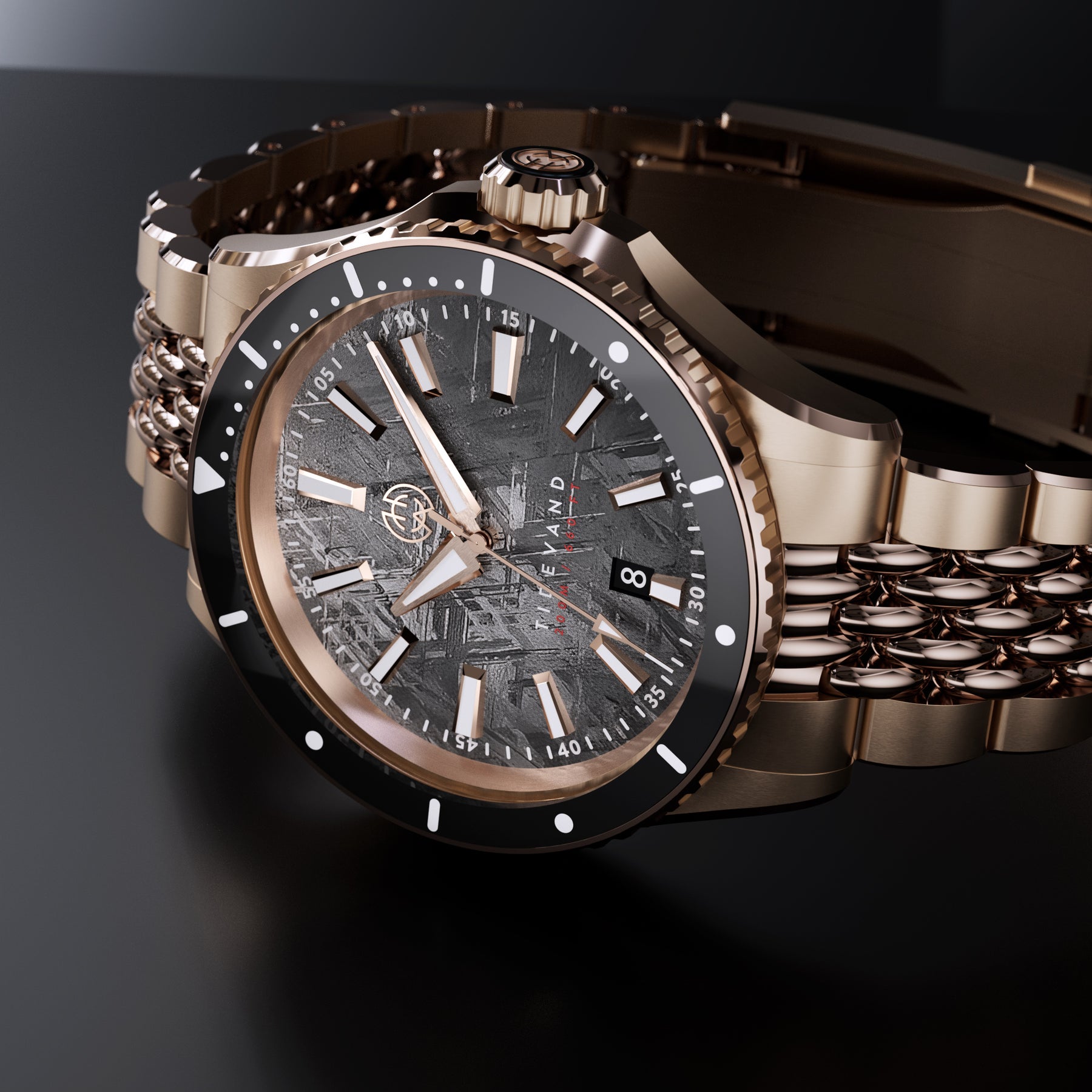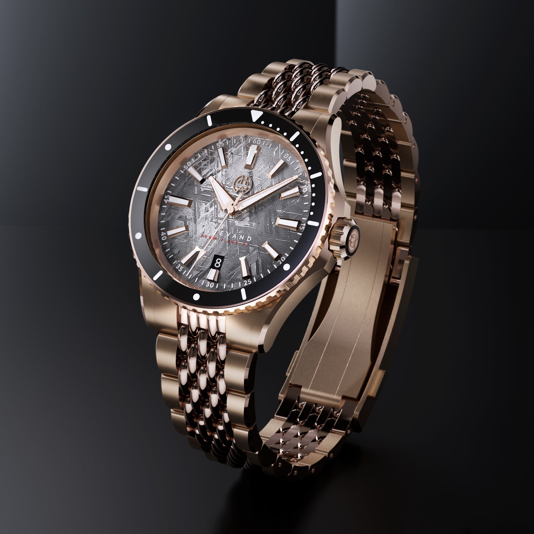 The fractal pattern on the meteorite dial is only found in meteorite stones and in the interiors of planets, and forms when iron cools under extreme pressure over millions of years.