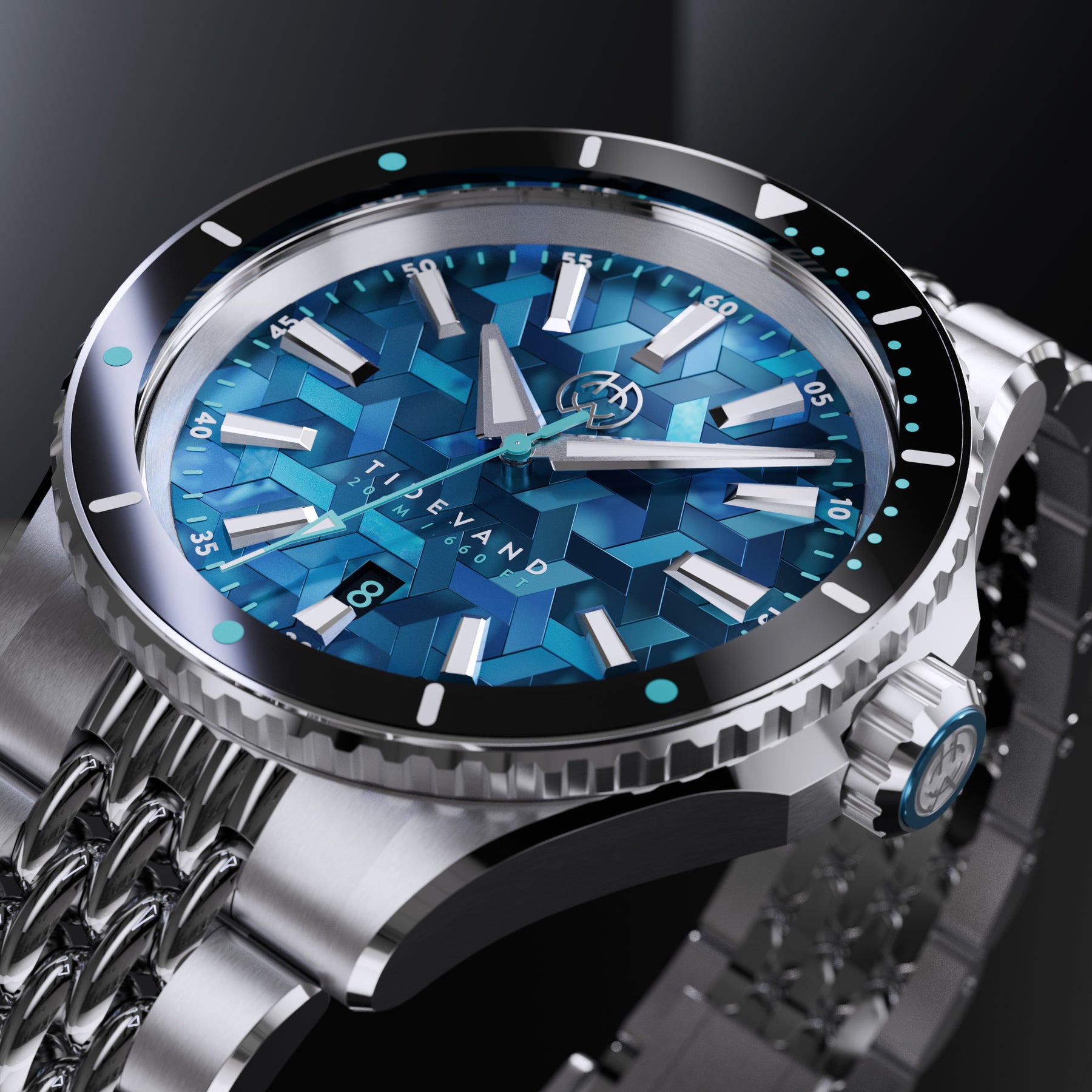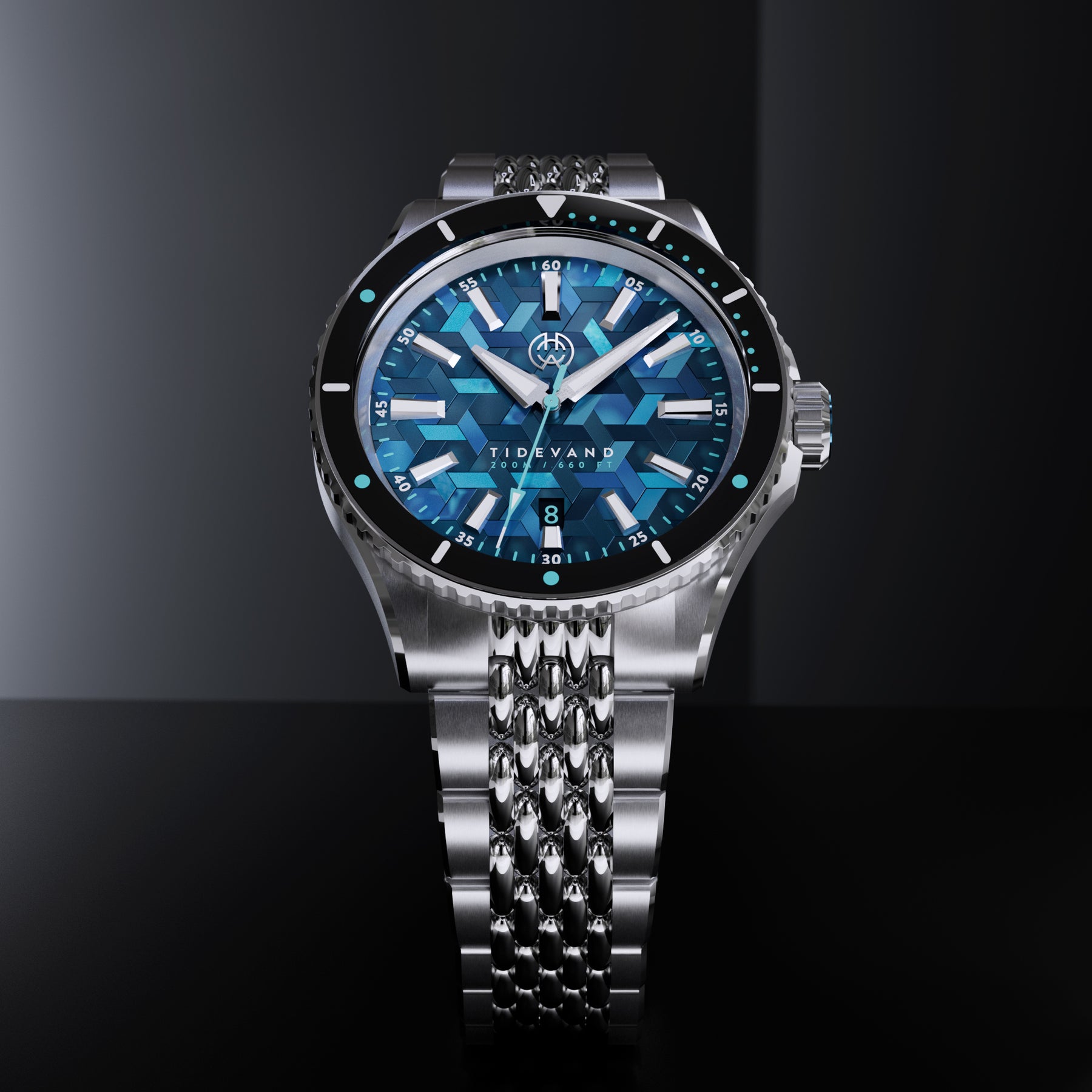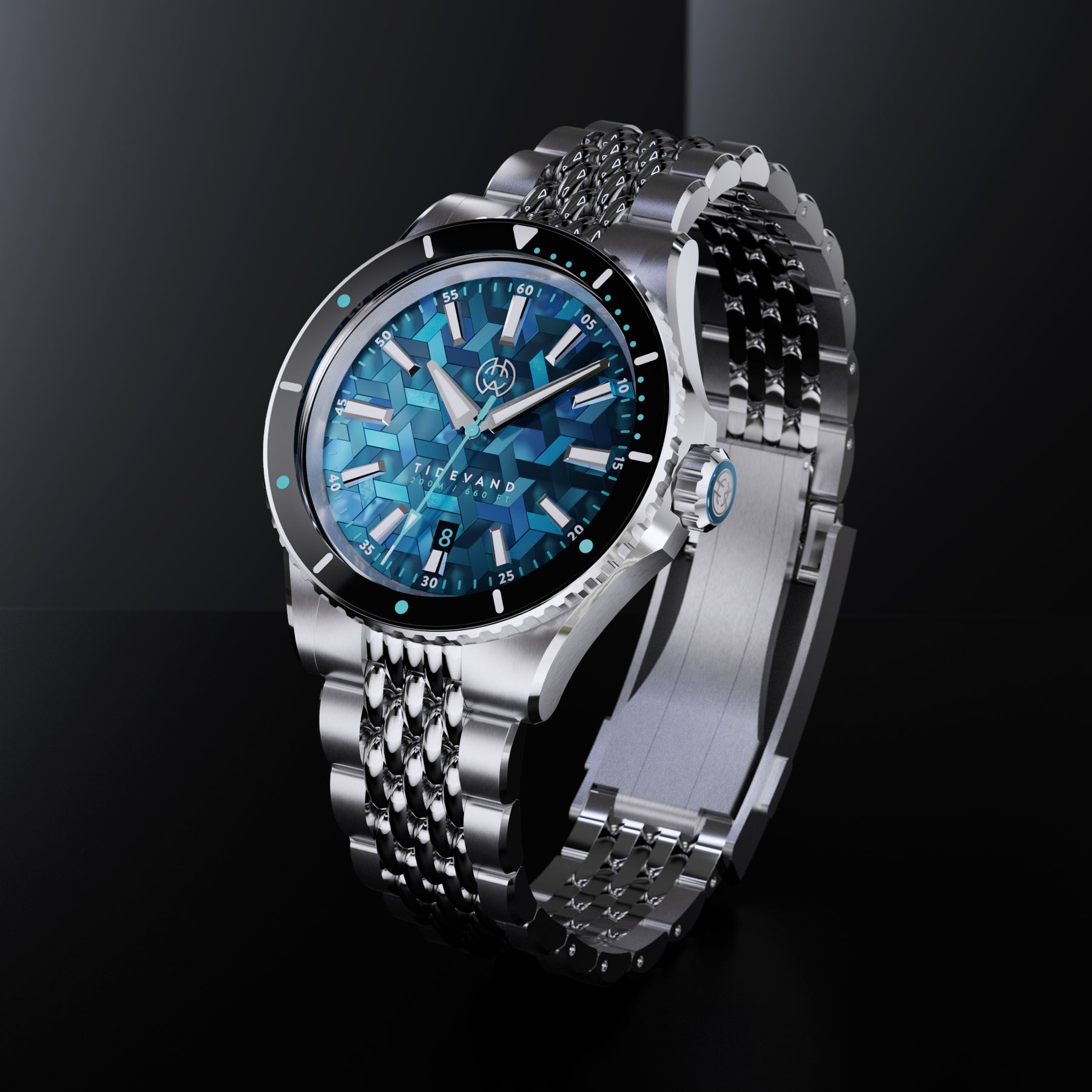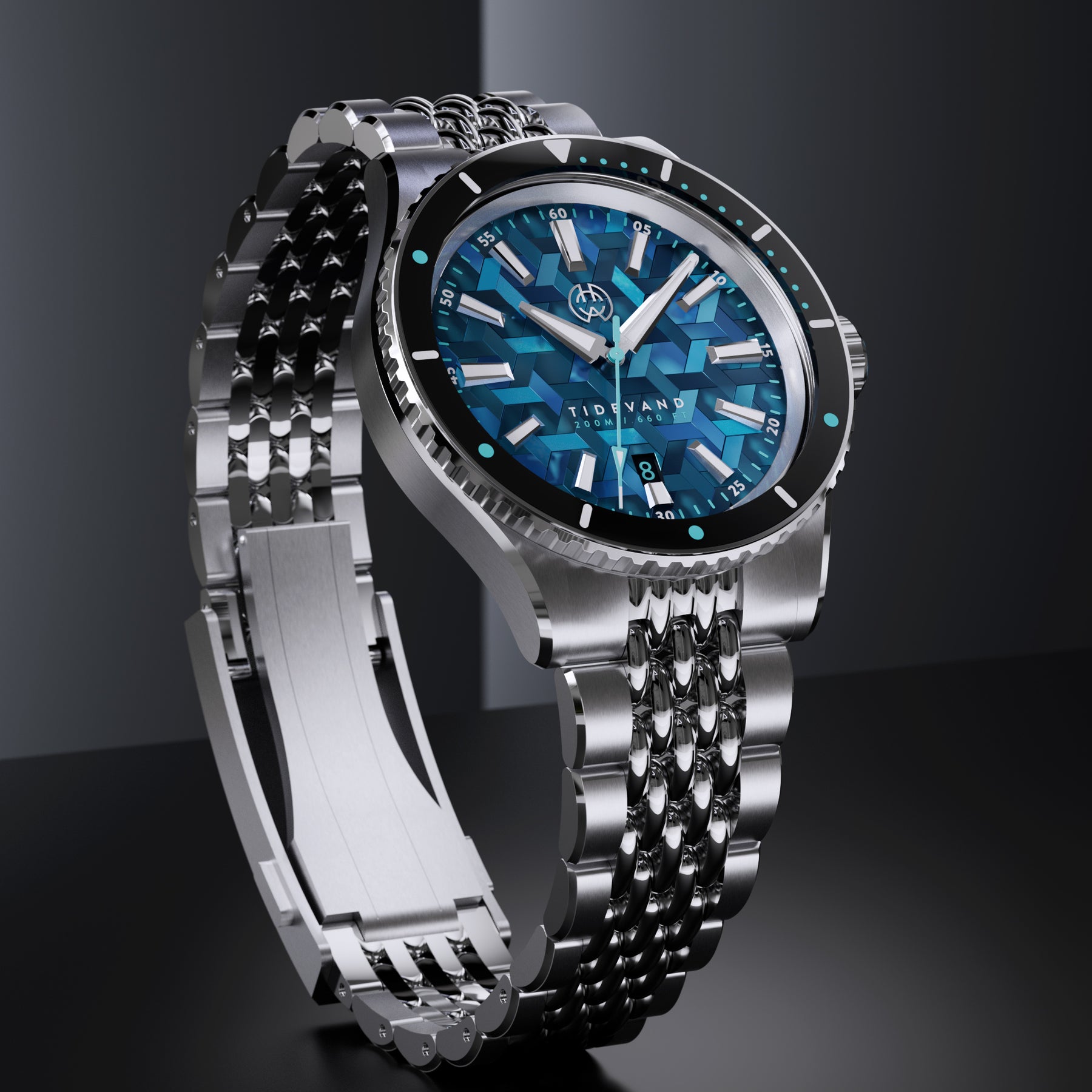 TIDEVAND is a purpose-built dive watch with 200 meters of water resistance, strong nighttime visibility, and a 120-click diver's bezel for precise timing. Designed for use in and around the sea, it balances rugged construction with refined finishing.