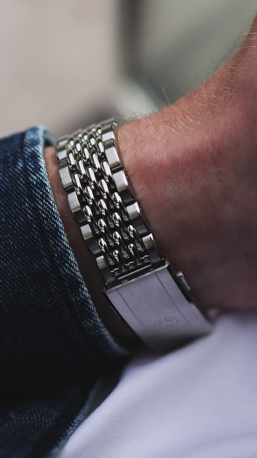 TIDEVAND is available with two distinct bracelet options. The Moon Grey Beads of Rice is inspired by bracelet designs from the 70s and is known for its exceptional comfort, thanks to its individually articulating, rounded links that naturally follow the shape of the wrist.