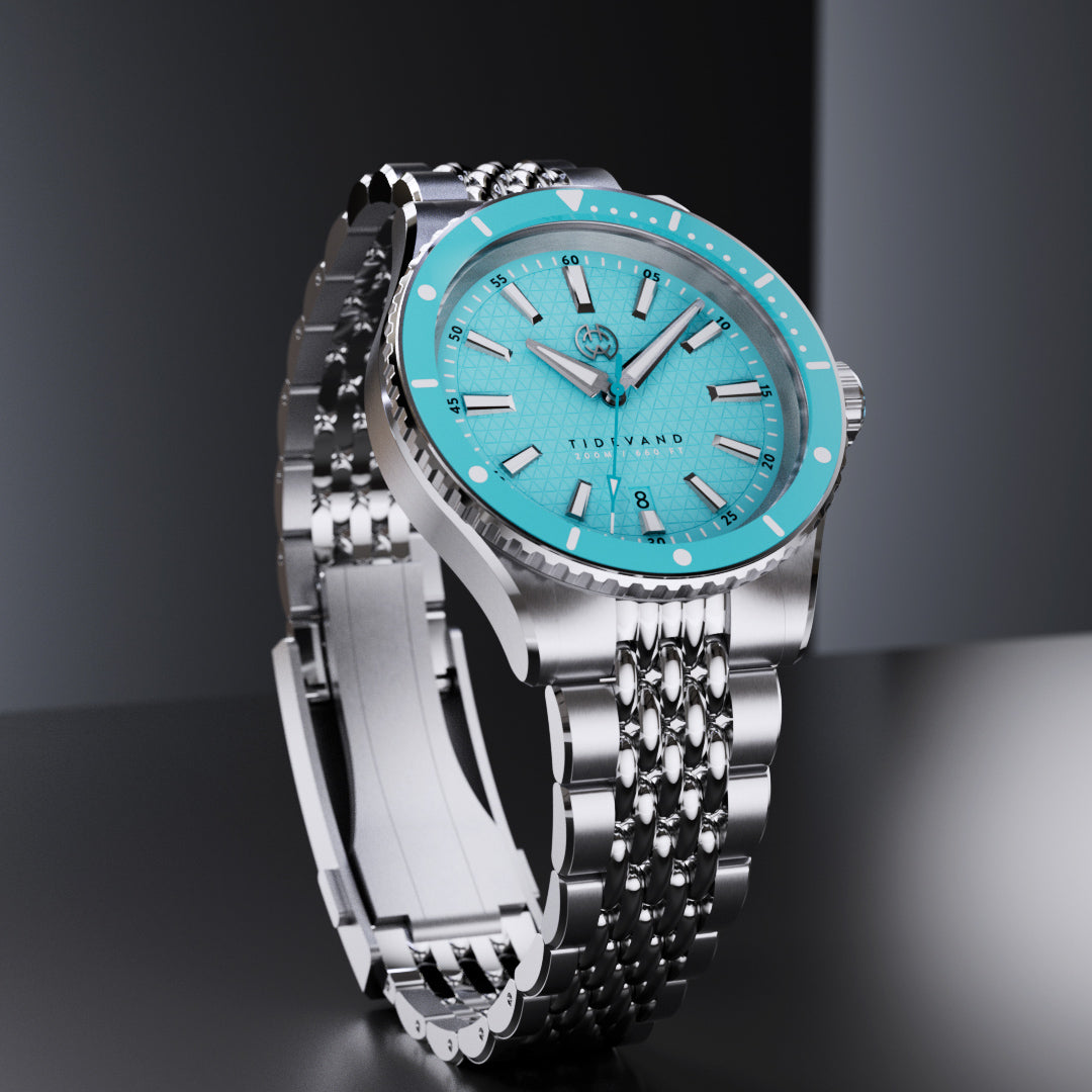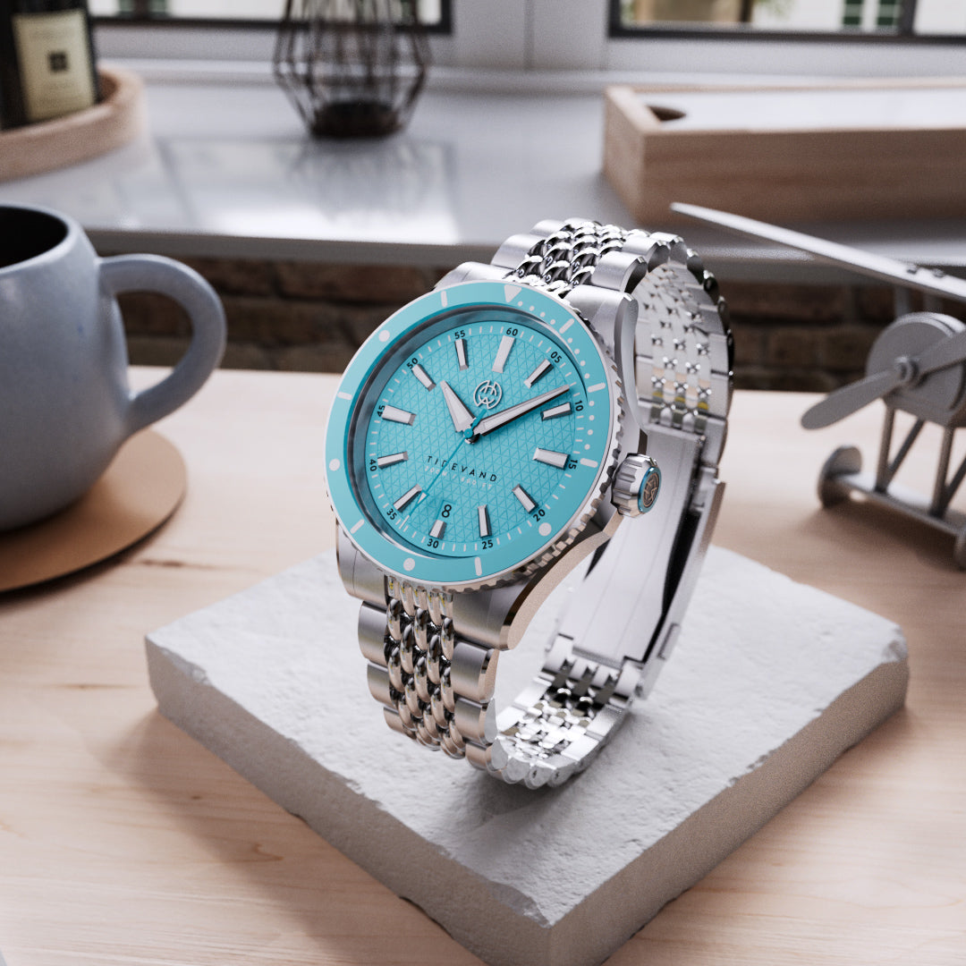TIDEVAND is a purpose-built dive watch with 200 meters of water resistance, strong nighttime visibility, and a 120-click diver's bezel for precise timing. Designed for use in and around the sea, it balances rugged construction with refined finishing.