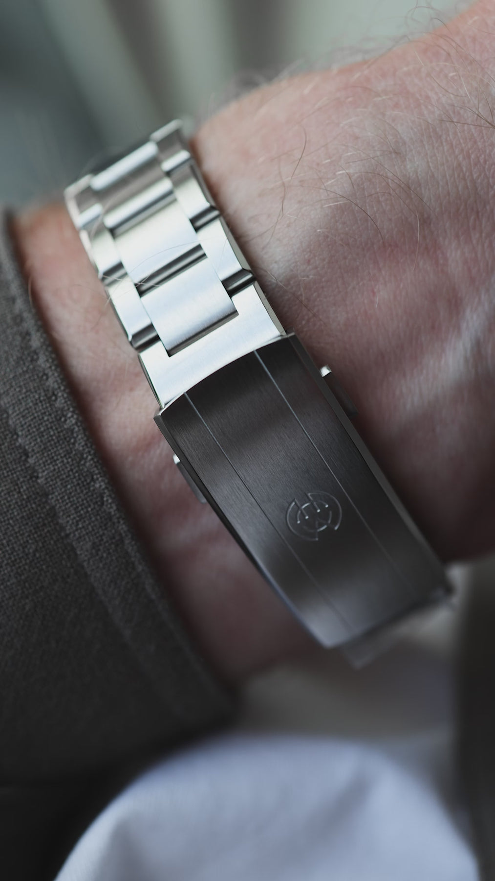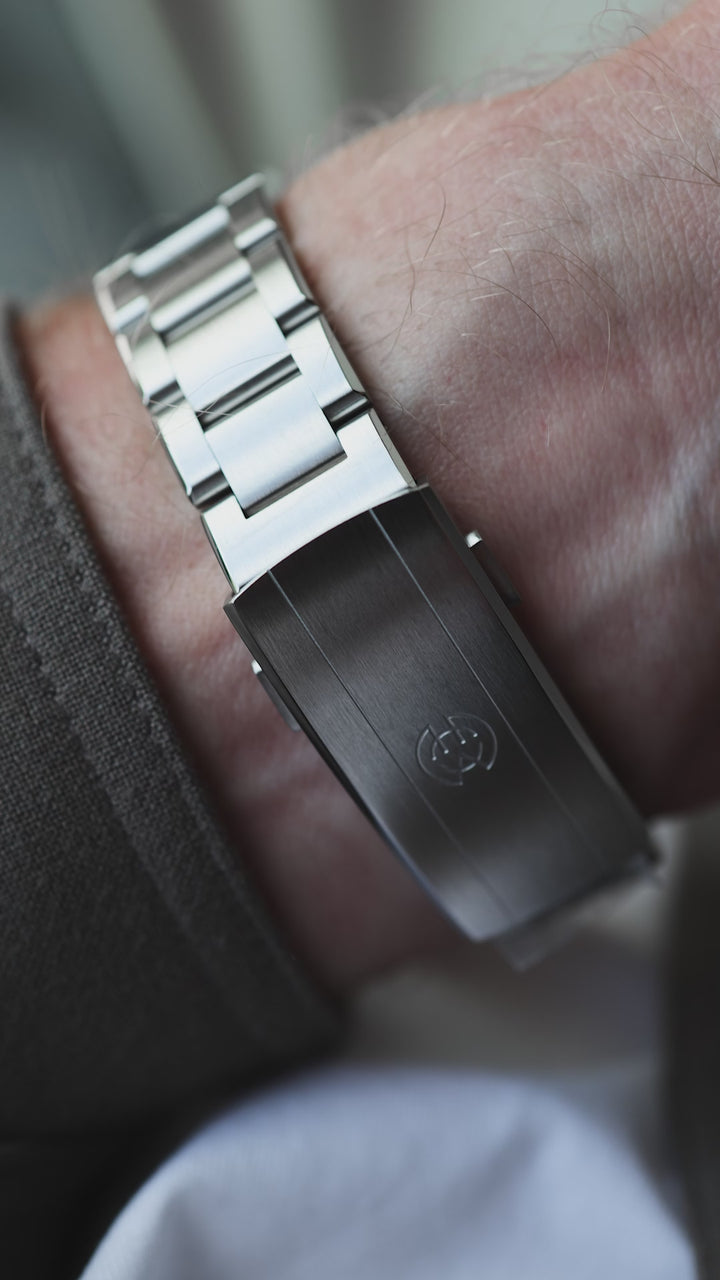 The bracelet comes with our fully milled signature clasp with on-the-fly micro-adjust. Perfect for the warm summer days when the wrist expands through the day.