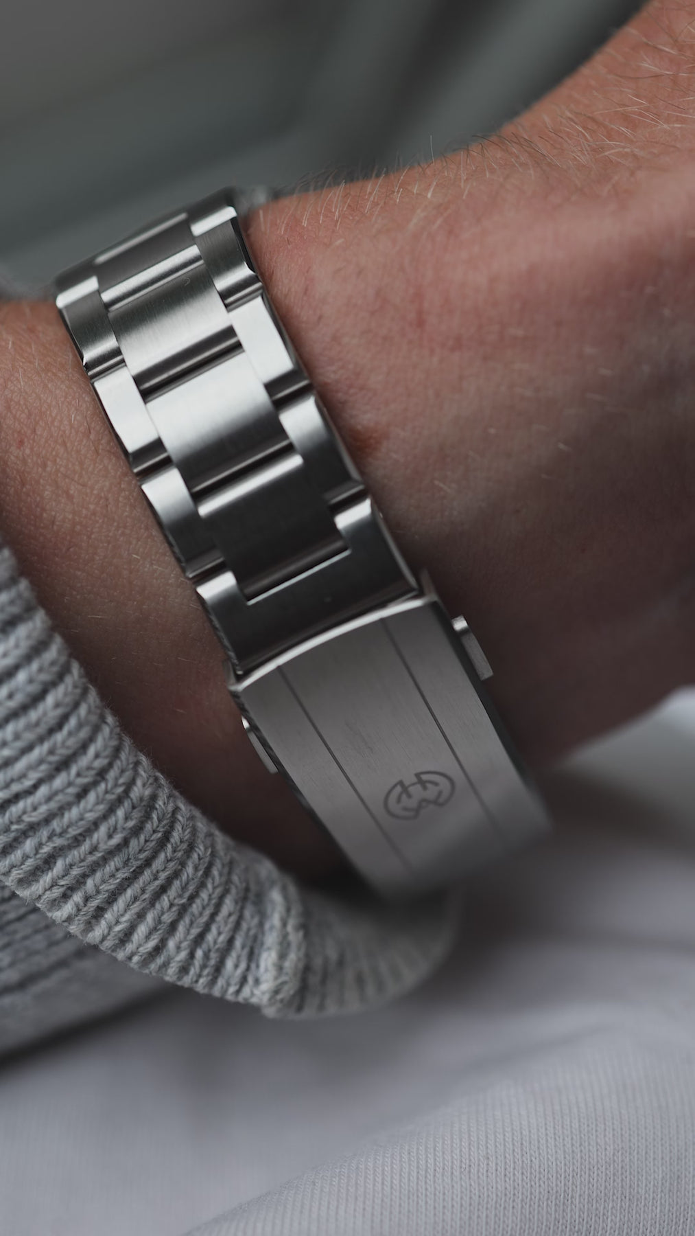 The bracelet comes with our fully milled signature clasp with on-the-fly micro-adjust. Perfect for the warm summer days when the wrist expands through the day.